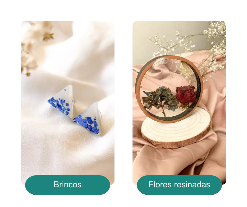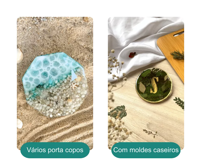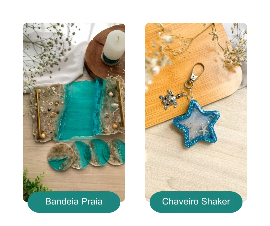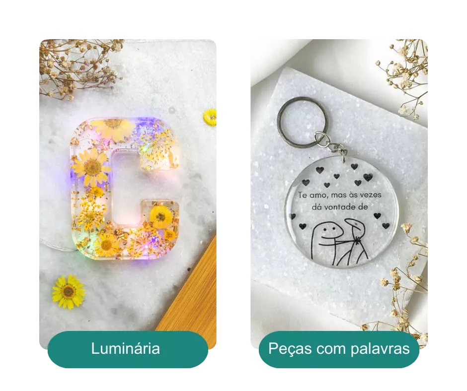 Você vai aprender a criar joias, chaveiros, dominós, marca-páginas, bandejas, eternizações, personalizações, quadros e muito mais - mesmo que nunca tenha tocado em resina antes.